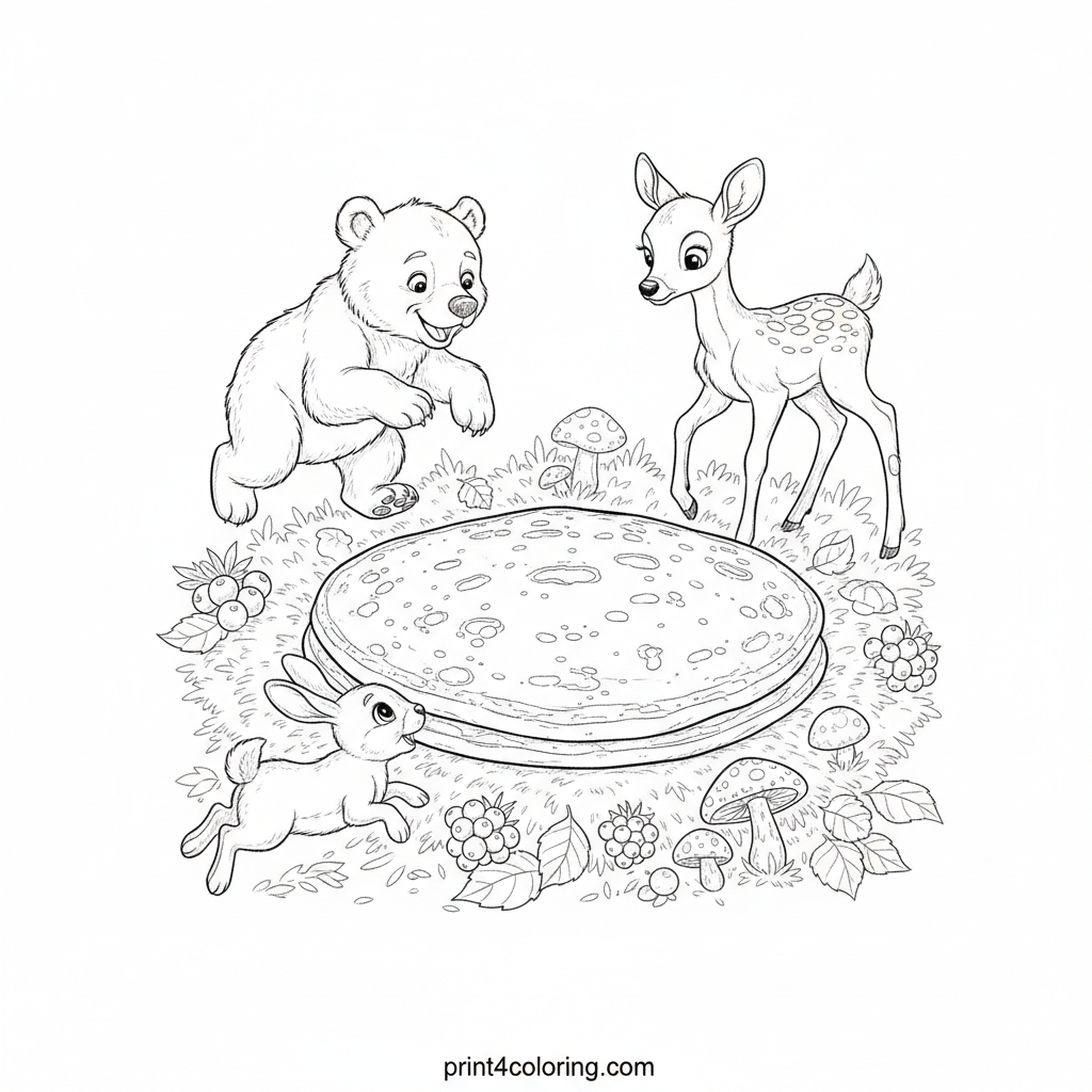 Discover a truly magical moment in the forest! A giant, fluffy pancake rests on soft moss, captivating a curious bear cub, a gentle deer fawn, and a tiny rabbit. Color this detailed, sun-dappled scene, bringing to life the woodland creatures' wonder and the delicious surprise of their unexpected feast.