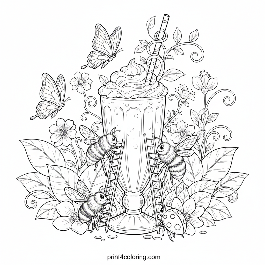 Step into a magical garden where friendly critters are having a delightful milkshake party! Ladybugs, bumblebees, and butterflies gather around a giant milkshake, using tiny ladders and vines to reach the sweet treat. This detailed scene amidst lush foliage invites you to bring vibrant colors to their whimsical celebration. Perfect for a fun coloring adventure!