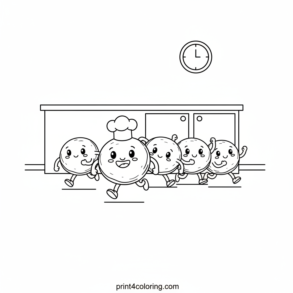 Join the fun as a group of cheerful pancakes with tiny legs and arms race across a bustling kitchen floor! One speedy pancake, sporting a miniature chef's hat, leads the pack with a big grin. Who will win this delicious dash? Grab your crayons and bring this silly scene to life!