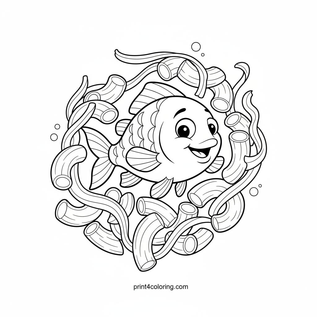Dive into an amazing underwater world with a friendly, wide-eyed fish on a playful adventure! Explore a magical maze of giant, colorful macaroni shapes and discover long, wiggly fettuccine seaweed. This page is bursting with fun textures, inviting you to add vibrant colors to every noodle and fin.