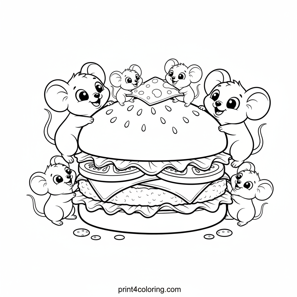 Join a delightful mouse family – Mom, Dad, and their two little ones – as they embark on an exciting adventure with a giant, delicious-looking burger! Watch them scamper, climb, and get ready for the most incredible meal ever. This cozy scene is full of tiny details and big fun, perfect for your coloring creativity!