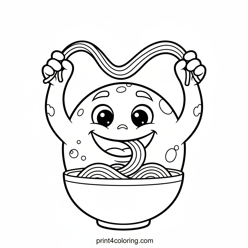 Meet a delightfully round and friendly monster with the happiest eyes, enjoying its favorite meal! Watch as it slurps a super long, wiggly noodle high into the air from a giant bowl. This cheerful creature is ready for you to bring its noodle-filled world to life with vibrant colors and imagination.
