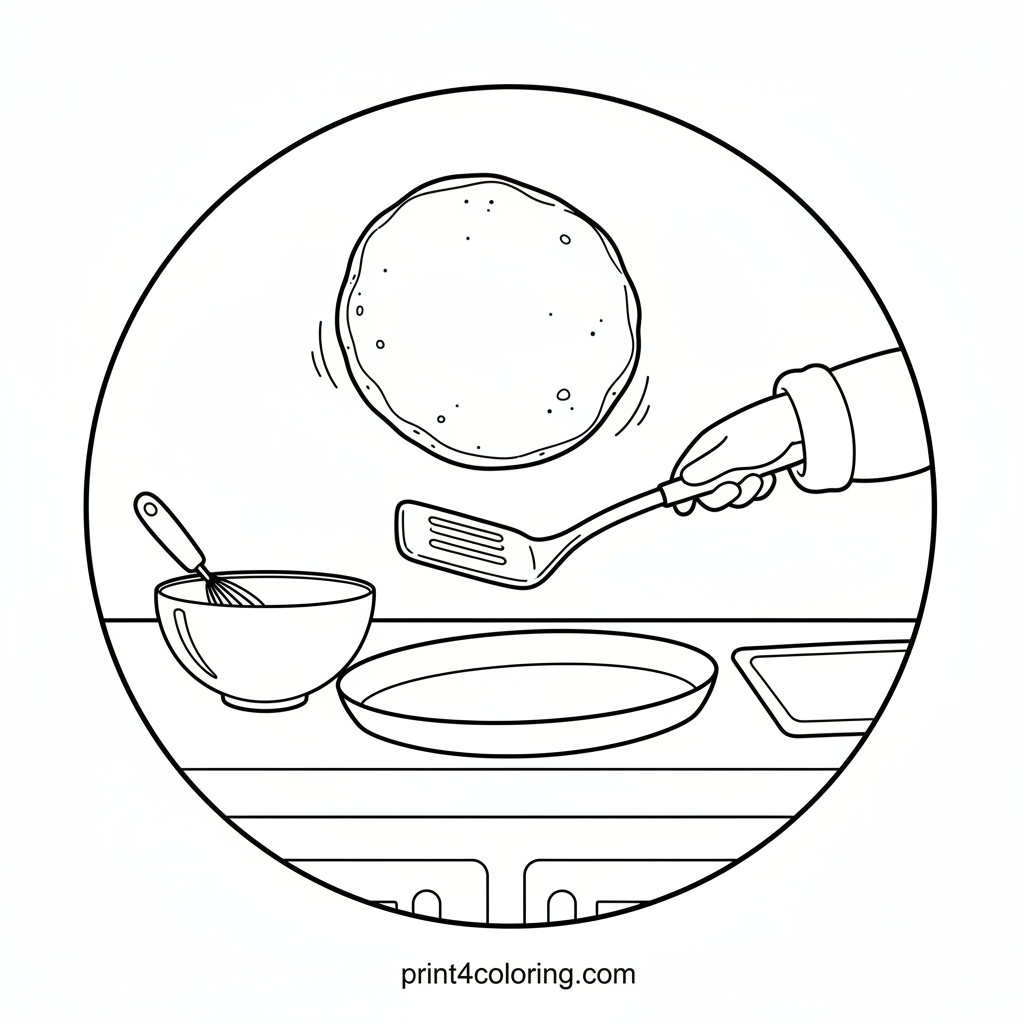 Witness the thrilling moment of a perfectly round pancake soaring mid-air, expertly flipped from a long-handled spatula! A friendly hand guides the flip over a warm griddle, with a cozy kitchen counter and mixing bowl hinting at more delicious creations. Get ready to add vibrant colors to this delightful breakfast scene!