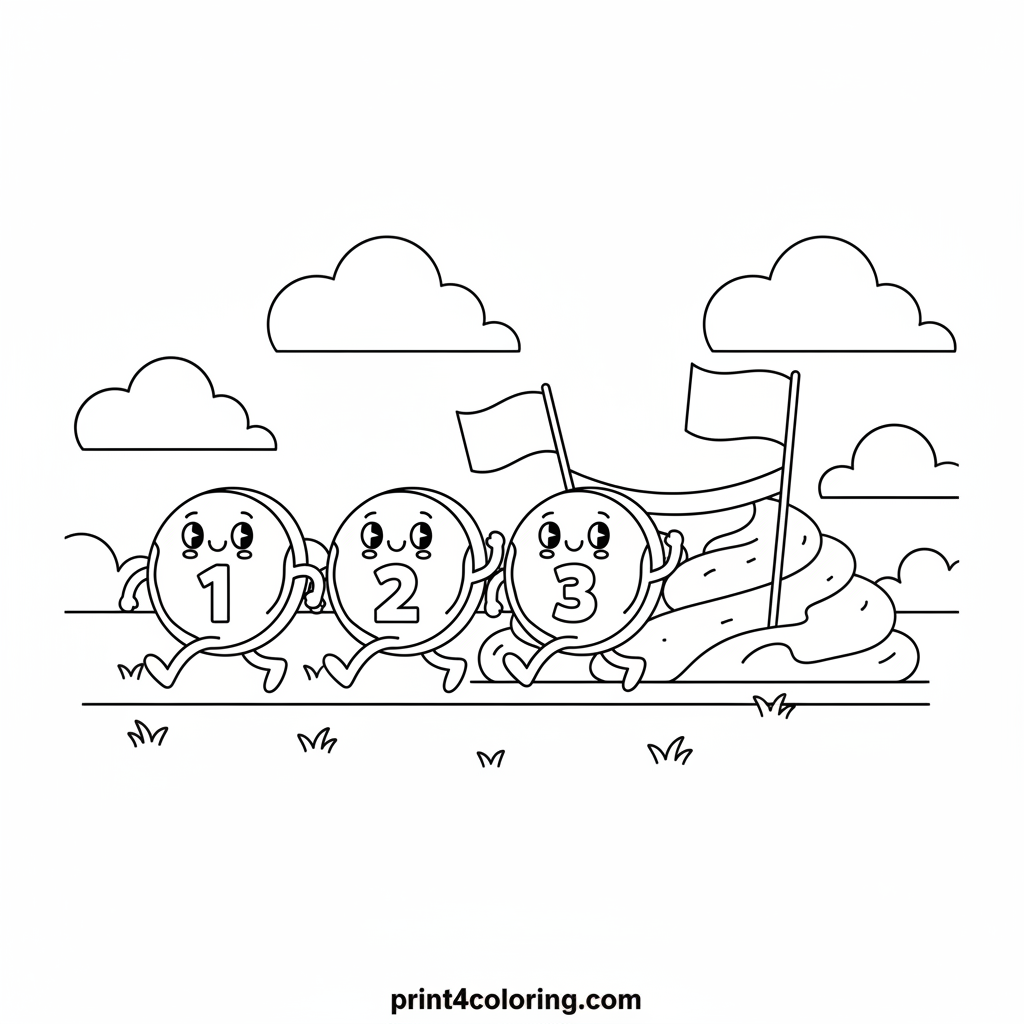 On your marks, get set, color! Watch three cheerful pancakes with tiny running legs sprint towards a yummy whipped cream finish line. Each pancake wears a little racing number, full of joy and friendly competition. Grab your crayons and bring this deliciously fun race scene to life!