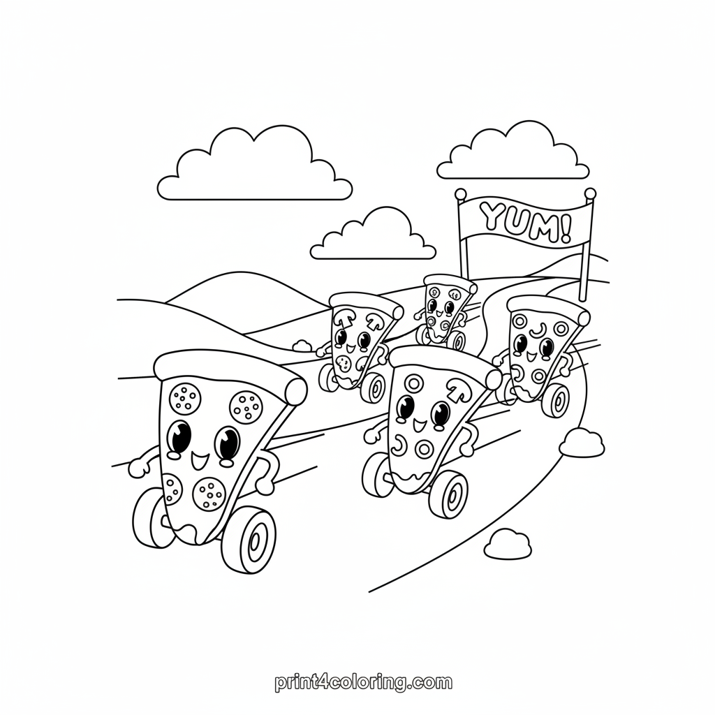 Get ready for a delicious adventure! Join smiling pizza slices, each with unique toppings and speedy wheels, as they race down a winding road. They're zooming towards the 'YUM!' finish line banner in this whimsical scene. Who will win this cheesy competition? Grab your crayons and add vibrant colors!