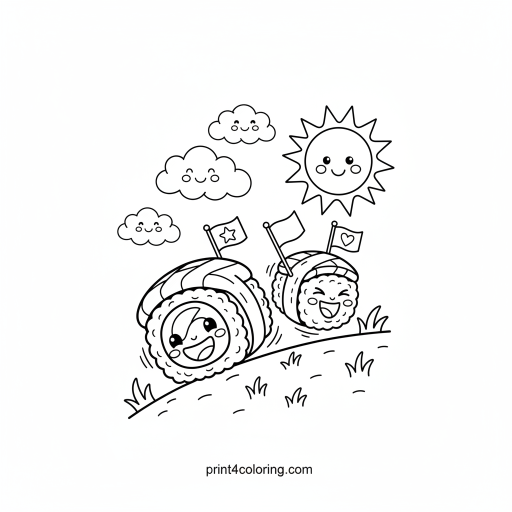 Get ready for a delicious dash! Join a happy California roll and a giggling nigiri as they zoom down a gentle hill in a friendly race. Watch out for the tiny chopstick flags waving at the finish line. This silly scene is packed with fun and flavor, just waiting for your vibrant colors!