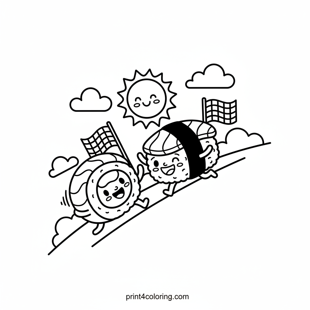 Get ready for a delicious dash! Join a happy California roll and a giggling nigiri as they zoom down a gentle hill in a friendly race. Watch their tiny chopstick flags wave as they roll towards the finish line. Who will win this yummy competition? Grab your crayons and add vibrant colors to this silly sushi adventure!