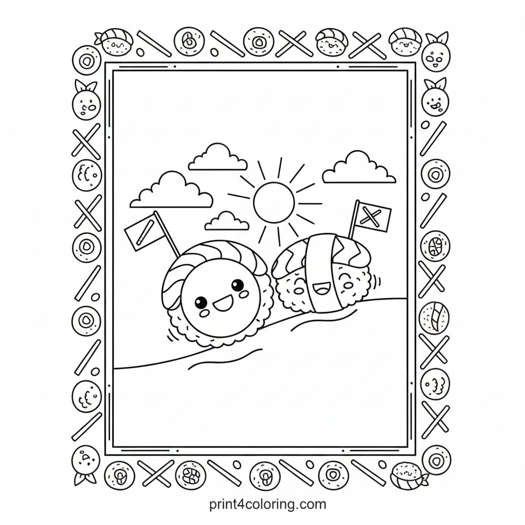 Get ready for a delicious dash! Join our happy California roll and giggling nigiri as they zoom down a gentle hill in the friendliest race ever. Tiny chopstick flags wave them on, adding to the excitement. Grab your crayons and bring this joyful sushi race to life with your favorite colors!
