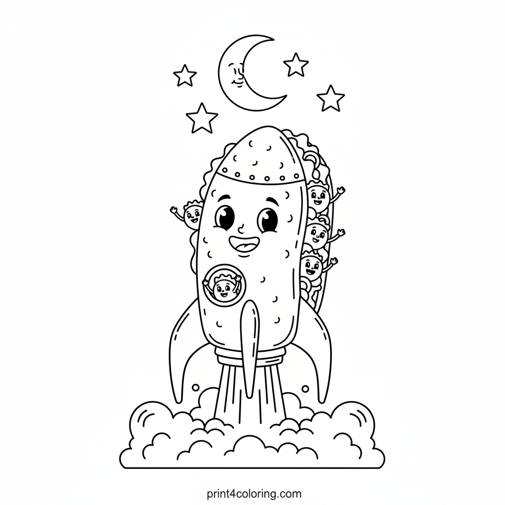 Join a crew of cheerful tacos on an out-of-this-world adventure! This delicious taco-shaped rocket is blasting off towards a friendly crescent moon, surrounded by twinkling stars. Imagine the yummy fun as these happy tacos explore space. A delightful scene for aspiring astronauts and foodies alike!