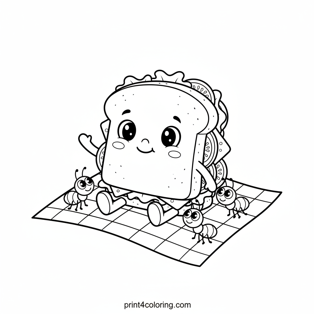 #sandwich#picnic#food#cute#cartoon#ants#coloring-page#printable
