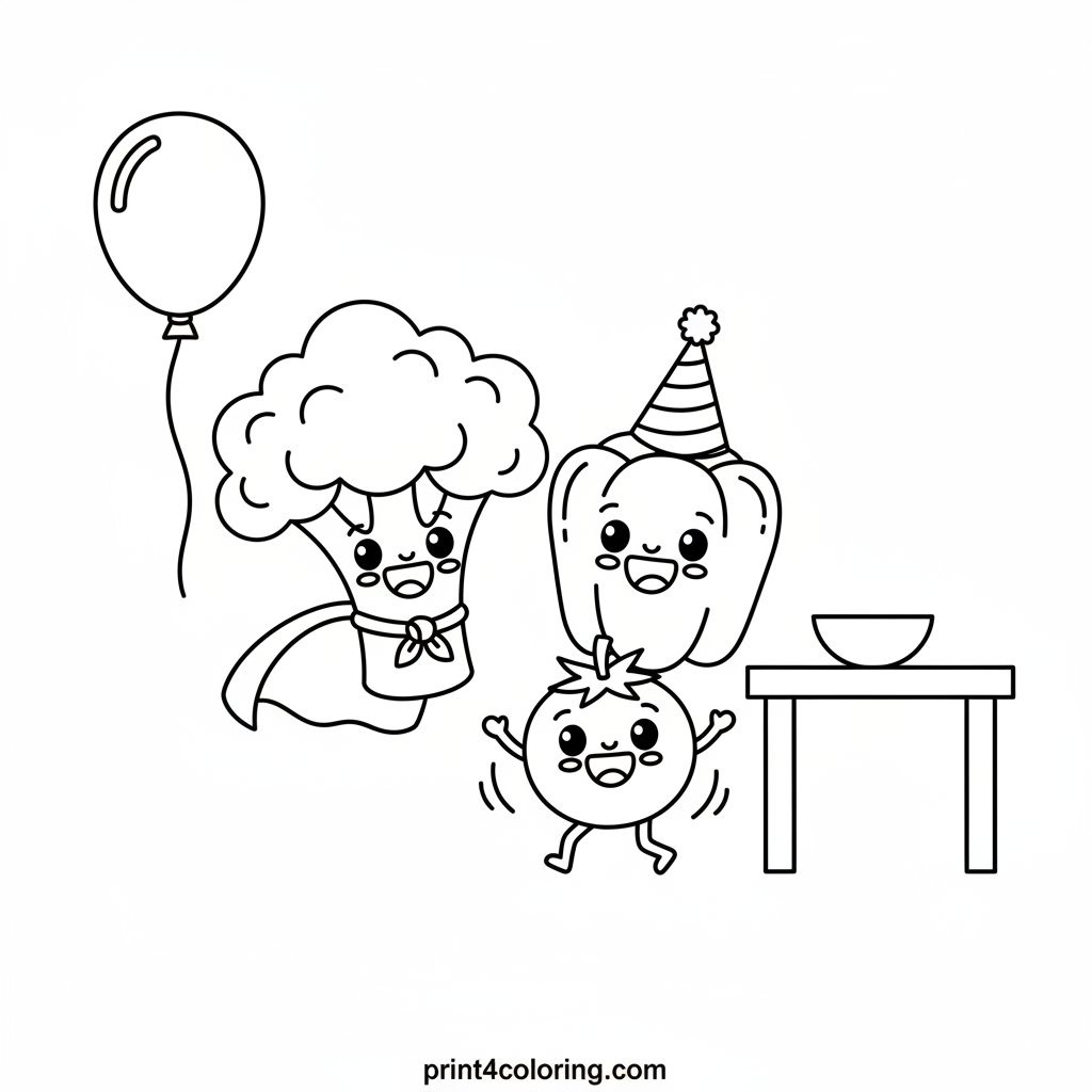 Get ready to color a hilarious veggie party! A brave broccoli floret wears a tiny superhero cape, while a cheerful bell pepper sports a silly party hat. Watch a tiny cherry tomato do a happy dance as all the veggies celebrate. Bring this super fun costume party scene to life with your favorite colors!