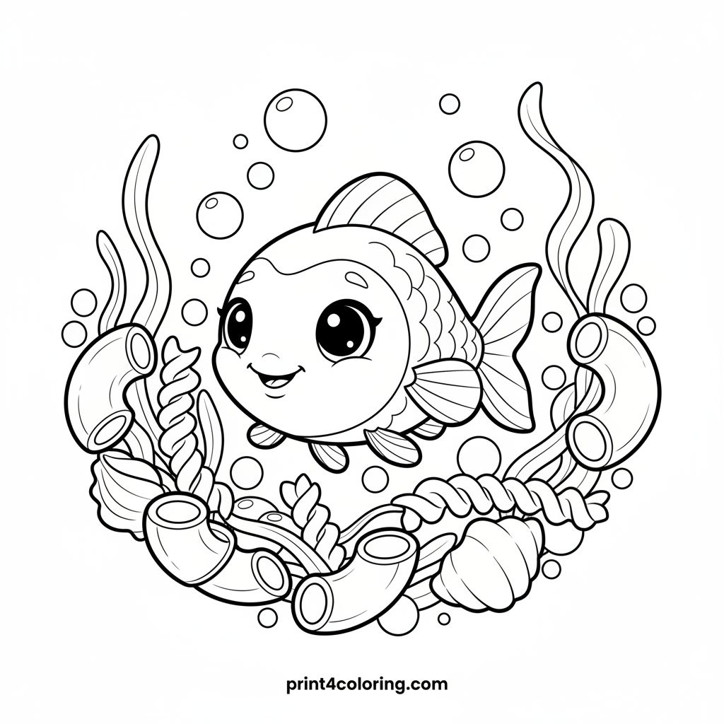 Dive into a whimsical underwater world! A cute, wide-eyed fish explores a fantastic realm where giant, colorful macaroni creates a playful maze. Swim through delicious shapes and discover seaweed made of long fettuccine strands. This cozy adventure is perfect for little artists to bring to life with their favorite colors!