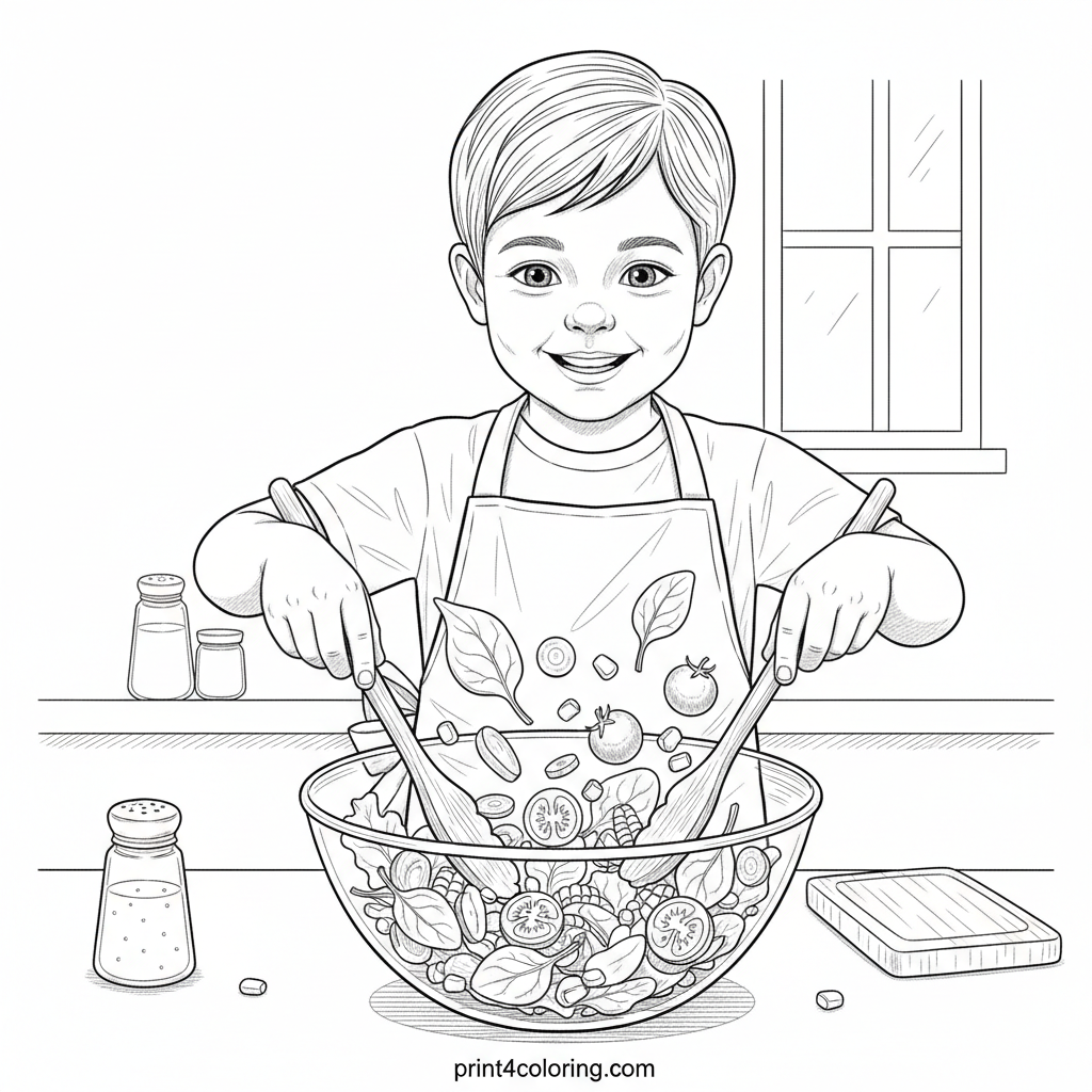 Watch a cheerful little chef's hands expertly toss a vibrant salad in a big glass bowl! Spinach leaves, carrots, cherry tomatoes, and corn kernels dance mid-air, showcasing the fun of healthy eating. This detailed scene highlights the joy of creating a delicious meal. Get ready to add your favorite colors!