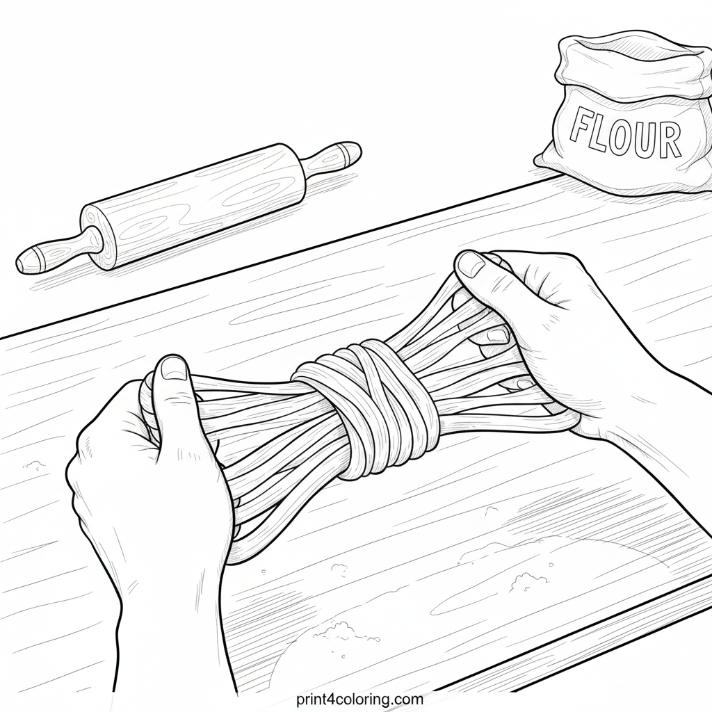 Dive into the fascinating world of hand-pulled noodles! This intricate coloring page captures a close-up of skilled hands gracefully stretching and folding dough, creating long, delicious strands. Imagine the texture and warmth as you bring this culinary art to life with your colors. A true masterpiece of kitchen magic!