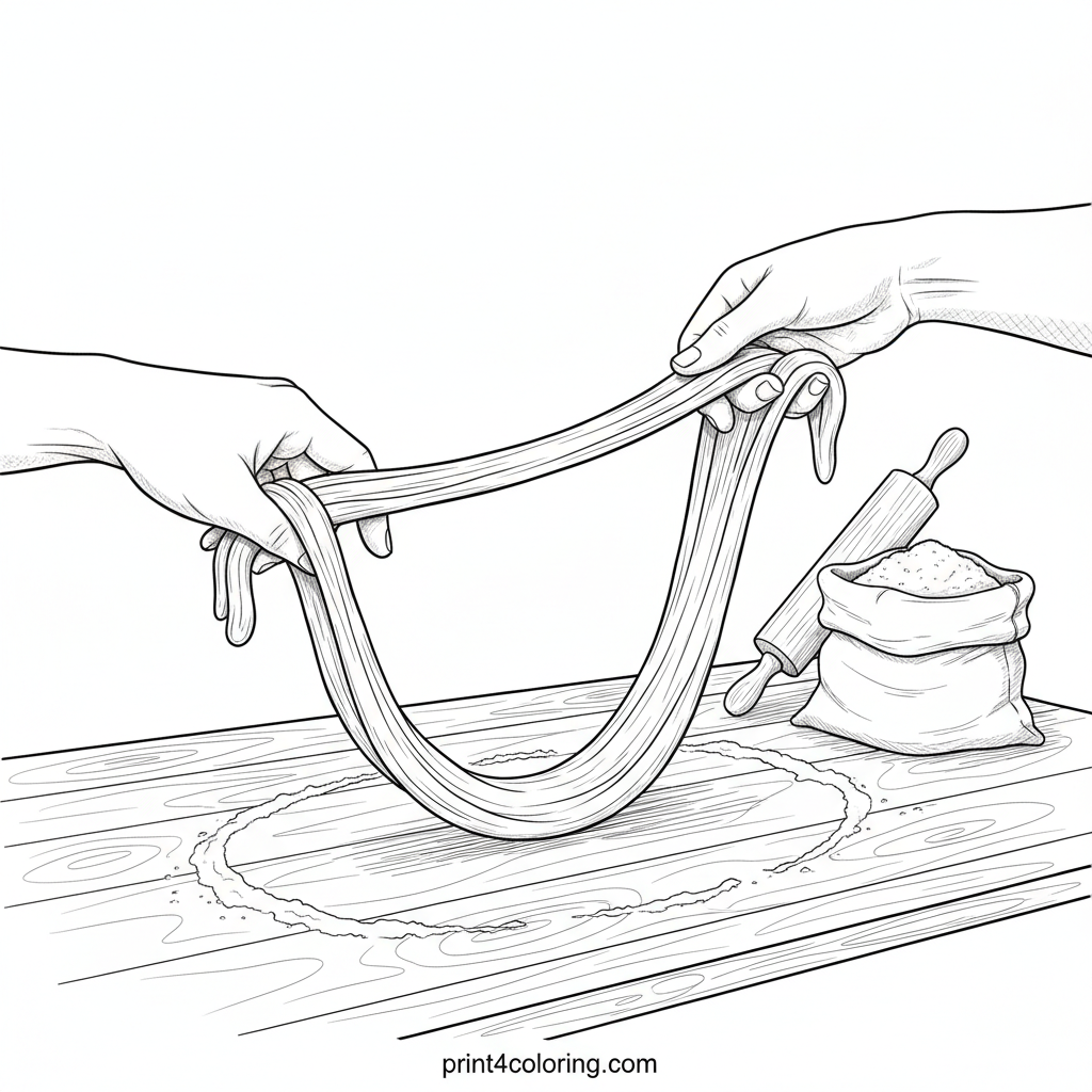 Discover the mesmerizing art of hand-pulled noodles! Watch skilled hands expertly stretch and fold dough into long, delicious strands, highlighting its amazing elasticity and texture. This detailed scene captures the traditional process on a lightly floured wooden surface, inviting you to color this unique culinary craft.
