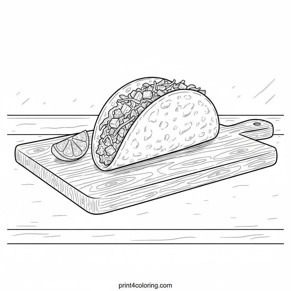Get ready to color a delicious challenge! This page features a perfectly crafted hard-shell taco, brimming with savory beef, crisp lettuce, diced tomatoes, and grated cheese. It rests on a rustic wooden board, with a fresh lime wedge. Focus on textures, shadows, and highlights to make this taco look truly mouth-watering!