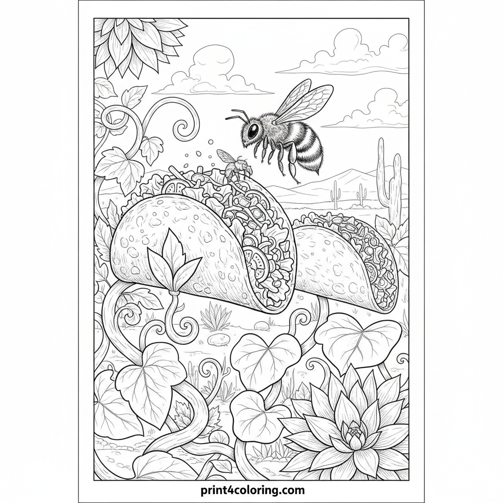 Imagine a magical garden where delicious tacos grow on plants! See soft-shell tacos on vines and hard-shell tacos blooming like flowers. Tiny bees and butterflies buzz, helping to pollinate these amazing taco plants amidst lush leaves. A delightful scene for expert colorists!