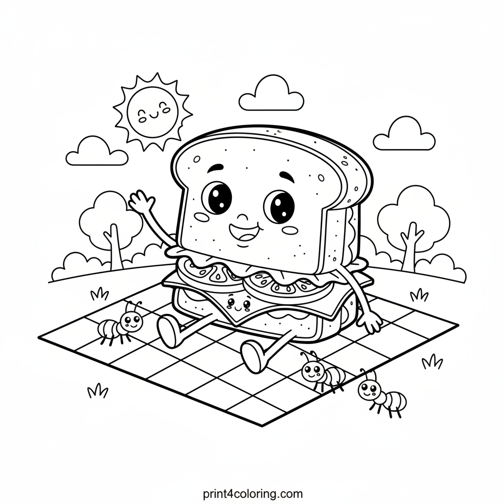 Join our delightful smiling sandwich, complete with big, cheerful eyes and playful stick arms and legs, as it enjoys a sunny day! This fun scene features the happy sandwich relaxing on a cozy checkered picnic blanket, surrounded by a few friendly ants. A perfect picture for a joyful coloring adventure!