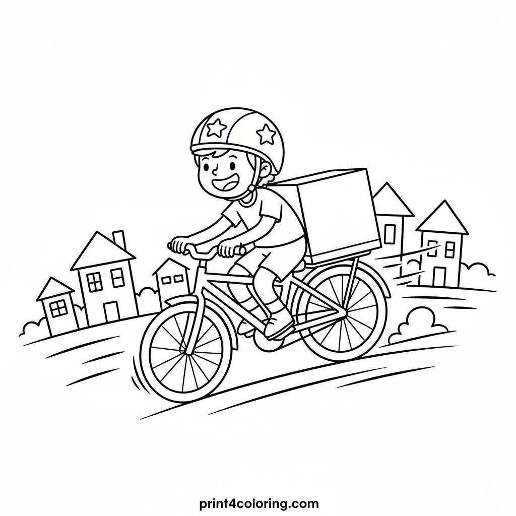 Get ready for a delicious adventure! This coloring page features a happy child on a super-fast bike, helmet on, delivering a giant pizza. Watch them zoom past friendly houses with speed lines trailing. Grab your crayons and bring this exciting pizza delivery scene to life with vibrant colors!