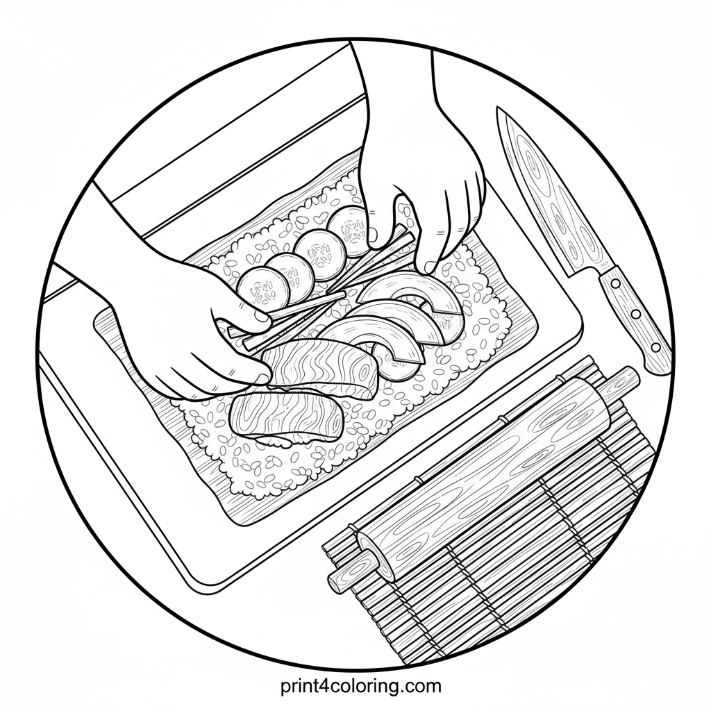 Dive into the cozy kitchen of a sushi chef, where tiny hands carefully craft delicious sushi. This detailed scene shows individual grains of rice, vibrant fresh fish, crisp cucumber, and creamy avocado laid out on nori. A bamboo mat and sharp knife await, ready to transform these ingredients into a masterpiece. A perfect page for expert colorists!
