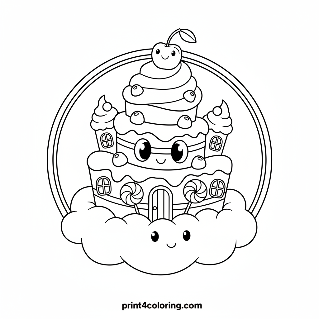 Imagine a truly magical place! This adorable castle is completely made of delicious cake, featuring swirly frosting turrets, sparkling candy windows, and a juicy cherry on its highest peak. It floats gently on a soft, fluffy cloud, inviting you to bring its whimsical charm to life with your brightest colors!