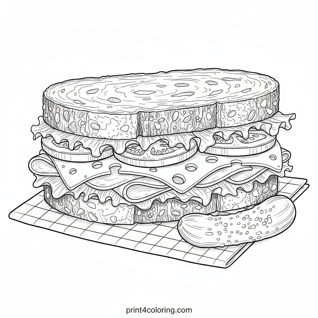 Savor the details of this perfect picnic sandwich! This expert coloring page showcases a gourmet masterpiece, artfully layered with whole-grain bread, crisp lettuce, ripe tomatoes, savory ham, and Swiss cheese. A detailed pickle spear rests invitingly beside it on a checkered napkin, ready for your colorful touch.