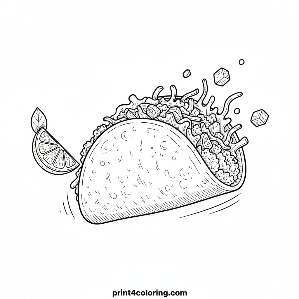 Get ready to color a delicious masterpiece! This expert-level page features a perfectly crafted hard-shell taco, brimming with seasoned beef, crisp lettuce, juicy tomatoes, and grated cheese. It rests on a rustic wooden board, accompanied by a zesty lime wedge, inviting you to explore intricate textures and vibrant colors.