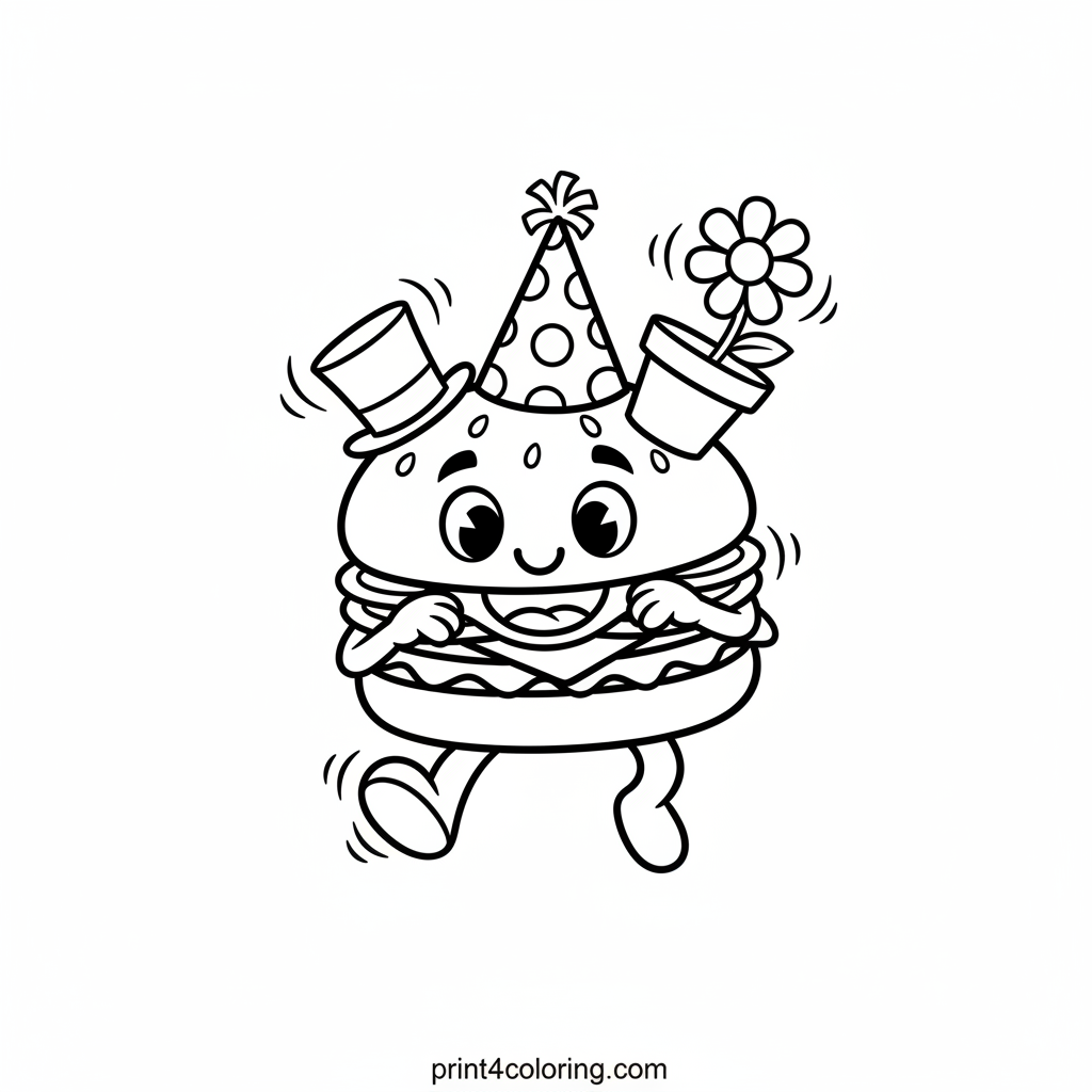 Join the fun with our cheerful burger friend! This happy patty is balancing a super silly stack of three funny hatsβa tiny top hat, a festive party hat, and even a flower pot. It looks a little wobbly but oh-so-delighted! Grab your crayons and add vibrant colors to this hilarious hat parade.