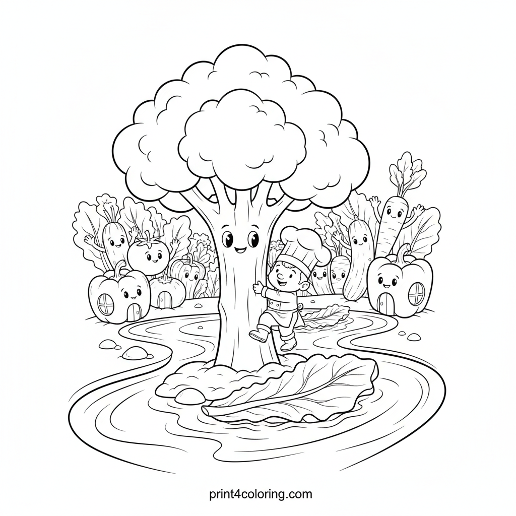 Join our brave little chef on an epic journey through a delicious salad world! Watch as they climb a towering broccoli tree and sail across a creamy dressing river. Friendly vegetable pals cheer them on in this delightful and whimsical adventure. A perfect scene for imaginative colorists!