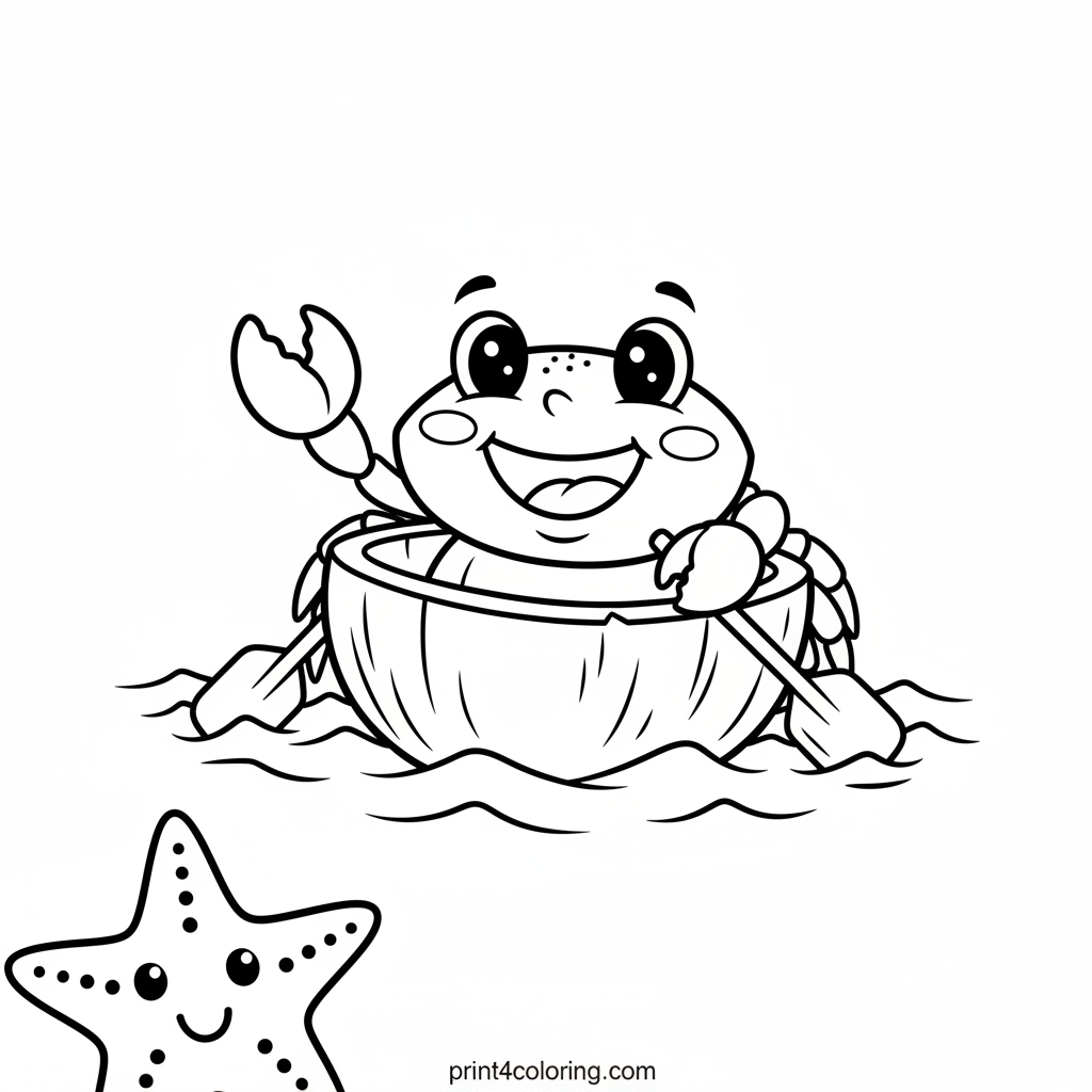 Join a cheerful little crab with big, friendly eyes as he embarks on an exciting journey! Watch him paddle his unique coconut canoe across gentle, wavy waters. On the sandy shore, a happy starfish waves hello, making this a delightful seaside scene perfect for young artists to bring to life with their favorite colors.