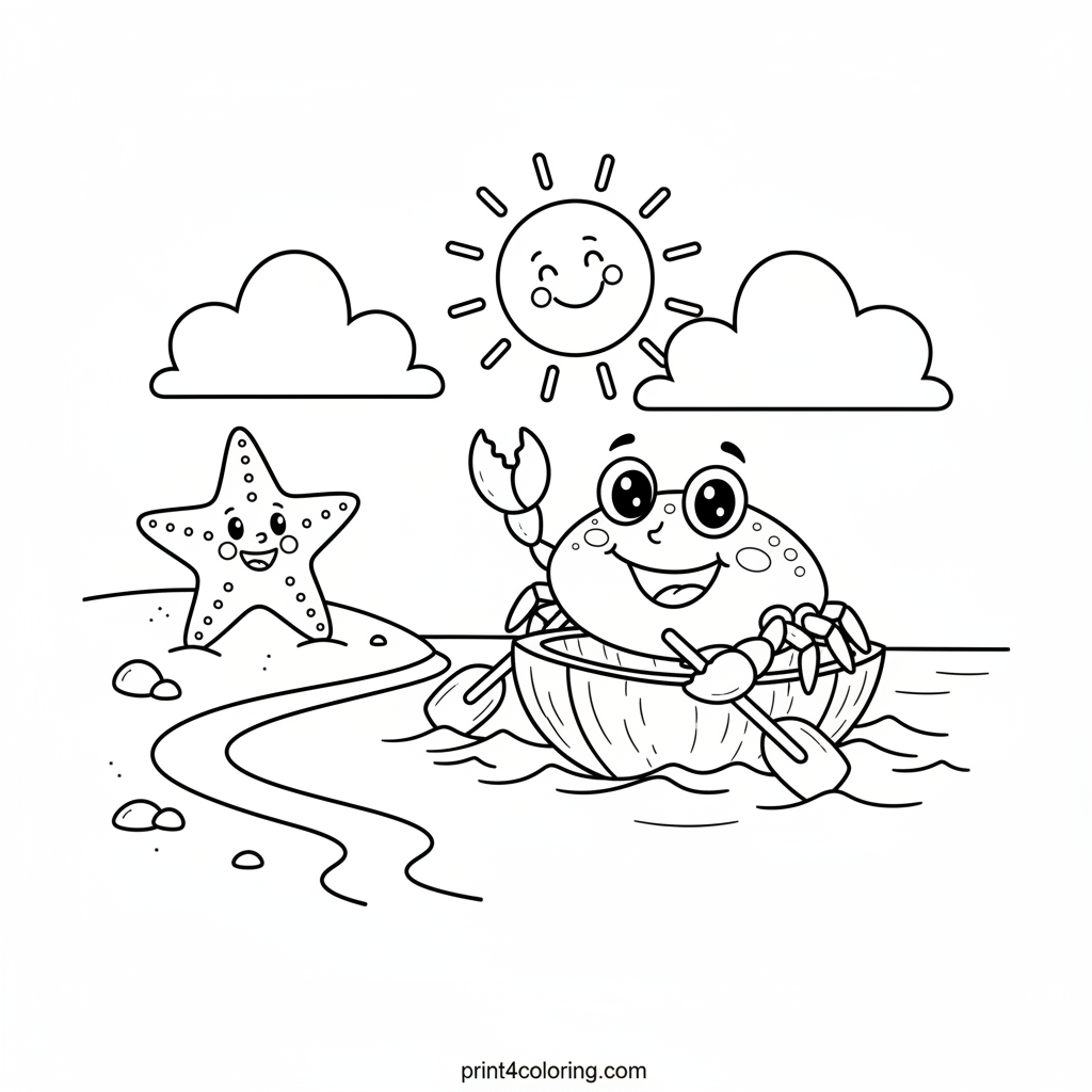 Embark on a delightful seaside journey with a cheerful little crab! This adorable scene features our happy crab expertly paddling a tiny coconut canoe across gentle ocean waves. A friendly starfish waves hello from the sandy shore, making this a perfect picture for young artists to bring to life with bright, happy colors.