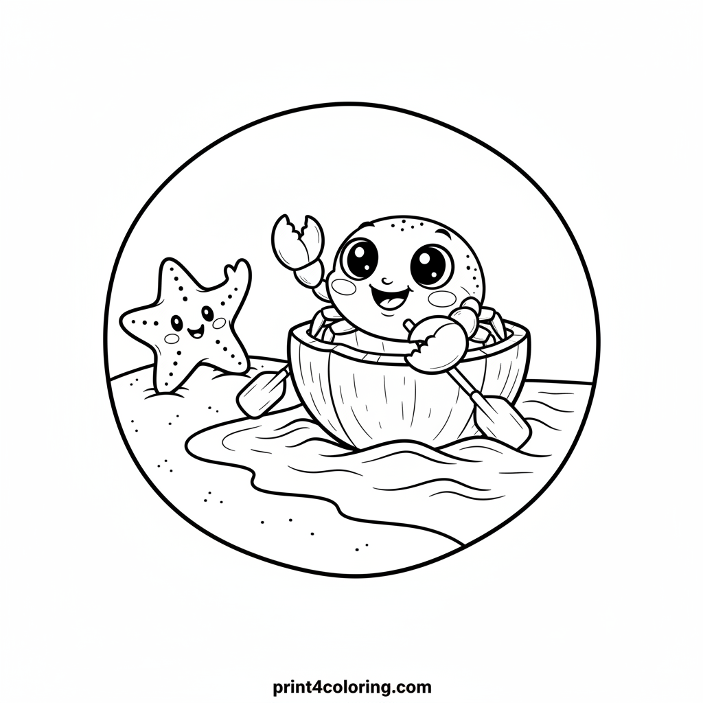 Join a delightful little crab with sparkling big eyes as he embarks on an exciting journey! He's paddling his cozy, hollowed-out coconut canoe across gentle, wavy waters. On the sunny shore, a cheerful starfish waves hello, making this a perfect scene for a relaxing seaside adventure. Get ready to add vibrant colors to their happy world!