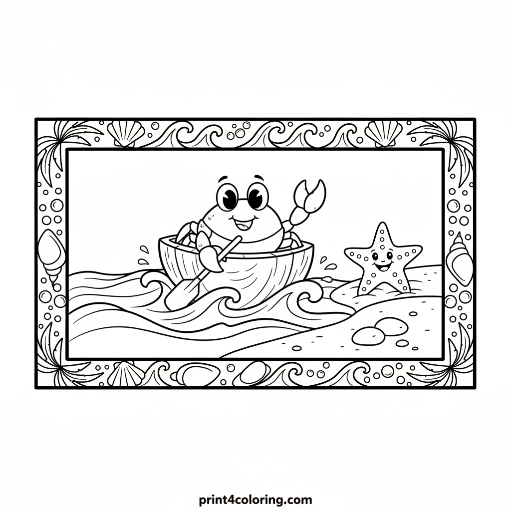 Join a cheerful little crab with big, happy eyes as he embarks on a delightful journey! He's paddling his unique coconut canoe across the gently wavy ocean. A friendly starfish waits on the sandy shore, waving a warm welcome. This scene is perfect for young artists to bring to life with vibrant colors and imagination.