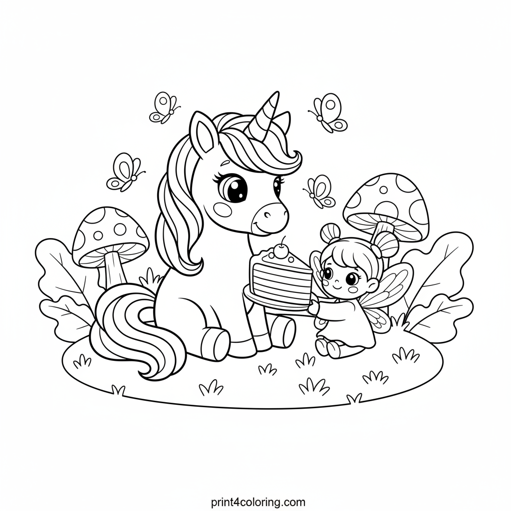 Join a friendly unicorn with a shimmering mane and a tiny fairy as they enjoy a delightful rainbow cake picnic! This enchanting scene unfolds in a whimsical forest, complete with gentle butterflies fluttering by. Perfect for sparking imagination and adding vibrant colors to a magical moment.