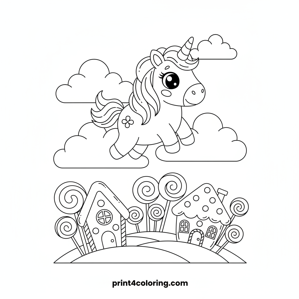 Enter a whimsical world where a friendly unicorn with a swirly horn gracefully flies through fluffy cotton candy clouds. Below, a sweet landscape unfolds with lollipop trees and charming gingerbread houses. Get ready to add vibrant colors to this magical, cozy adventure!