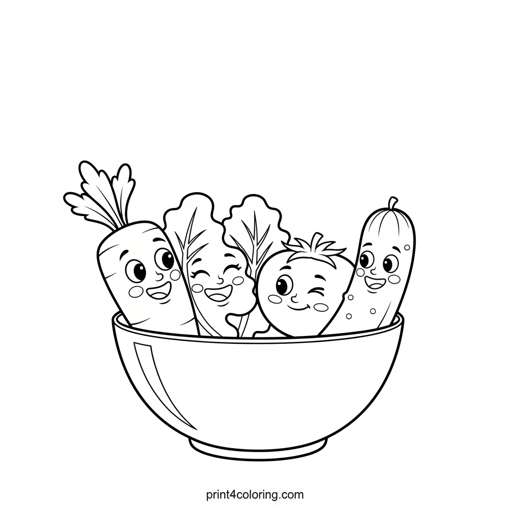 Join a cheerful bunch of veggie friends as they whip up a delicious super salad! See a winking tomato, a giggling lettuce, a happy carrot, and a friendly cucumber smiling while they gently toss colorful ingredients in a big bowl. Get ready to add your favorite hues to this joyful, healthy scene!