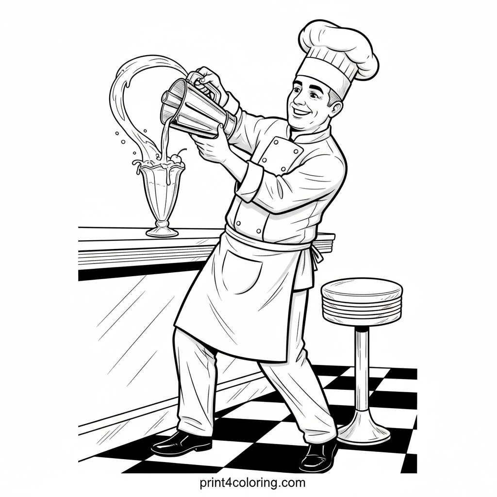 Step into a classic vintage diner scene where a cheerful chef is expertly pouring a delicious, frothy milkshake! This detailed page features shiny chrome, a checkered floor, and a tall glass waiting to be filled. Grab your crayons and bring this sweet, nostalgic moment to life with vibrant colors!
