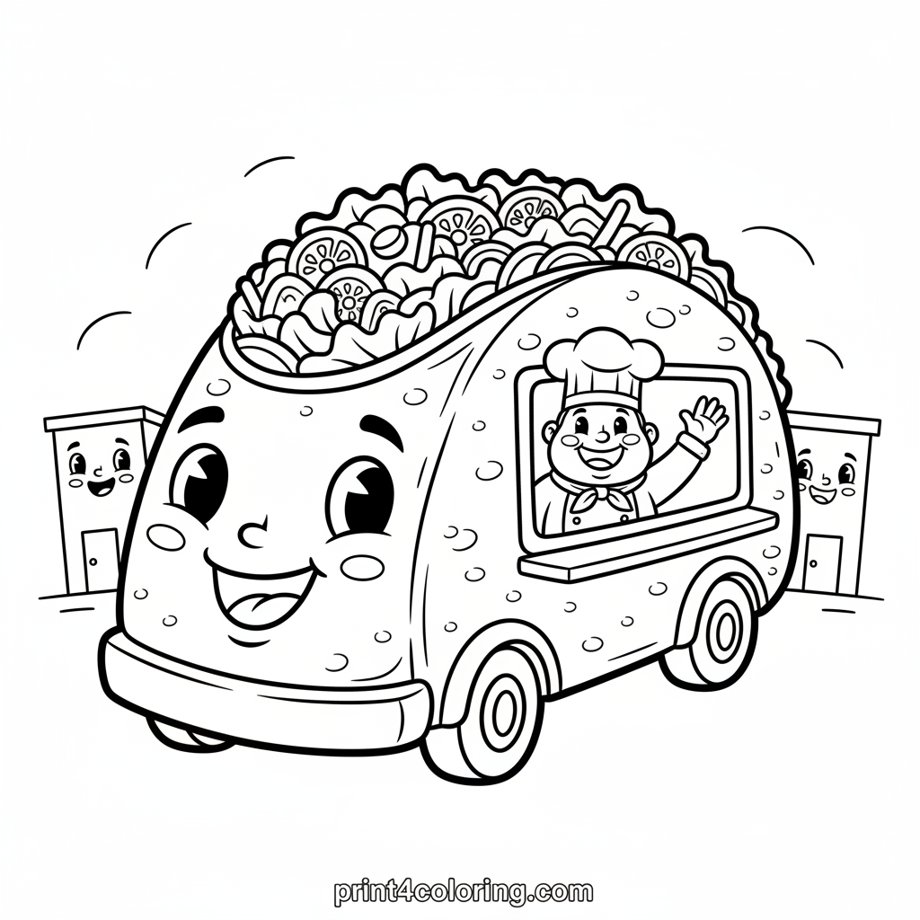 Get ready for a delicious adventure! This cheerful cartoon taco truck is rolling down a sunny street, with a friendly chef waving hello from the window. Simple, happy buildings dot the background, inviting you to add vibrant colors to this fun food scene. Grab your crayons and let the tasty journey begin!