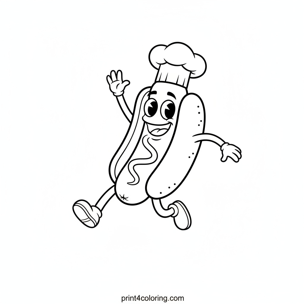 Meet our cheerful Hotdog Pal! This friendly character has a big, happy smile, bright eyes, and a super cute tiny chef's hat. He's waving hello just for you! Grab your crayons and bring this joyful hotdog to life with vibrant colors, making him ready for any happy adventure.