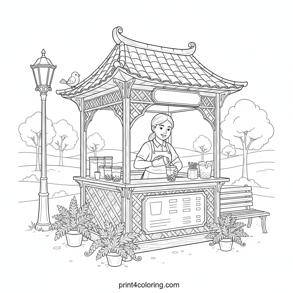 Step into a delightful scene at this charming boba tea kiosk! Discover intricate wooden details, a pretty tiled roof, and a friendly vendor crafting delicious drinks. Look closely for the happy bird on the lamp post and lush ferns, creating a peaceful spot to imagine your favorite boba flavors. A wonderfully detailed scene for expert colorists!