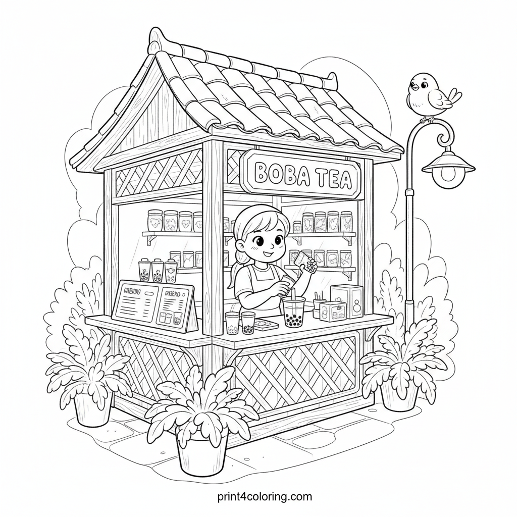 Discover the magic of a cozy boba tea kiosk, intricately drawn with delicate wooden lattice and a charming tiled roof. A friendly vendor prepares drinks, while potted ferns and a happy bird add to the serene atmosphere. Bring this whimsical scene to life with your favorite colors!