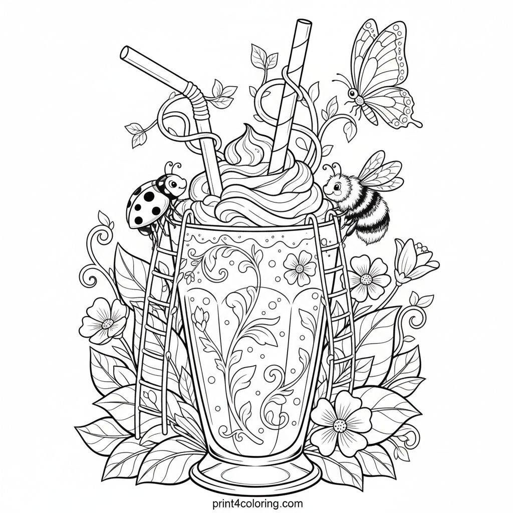 Dive into a delightful close-up scene where friendly garden critters like ladybugs, bumblebees, and butterflies are having a grand milkshake party! Watch them use tiny ladders and vines to reach a giant, ornate milkshake glass overflowing with whipped cream. A truly whimsical and detailed nature adventure awaits your colors!