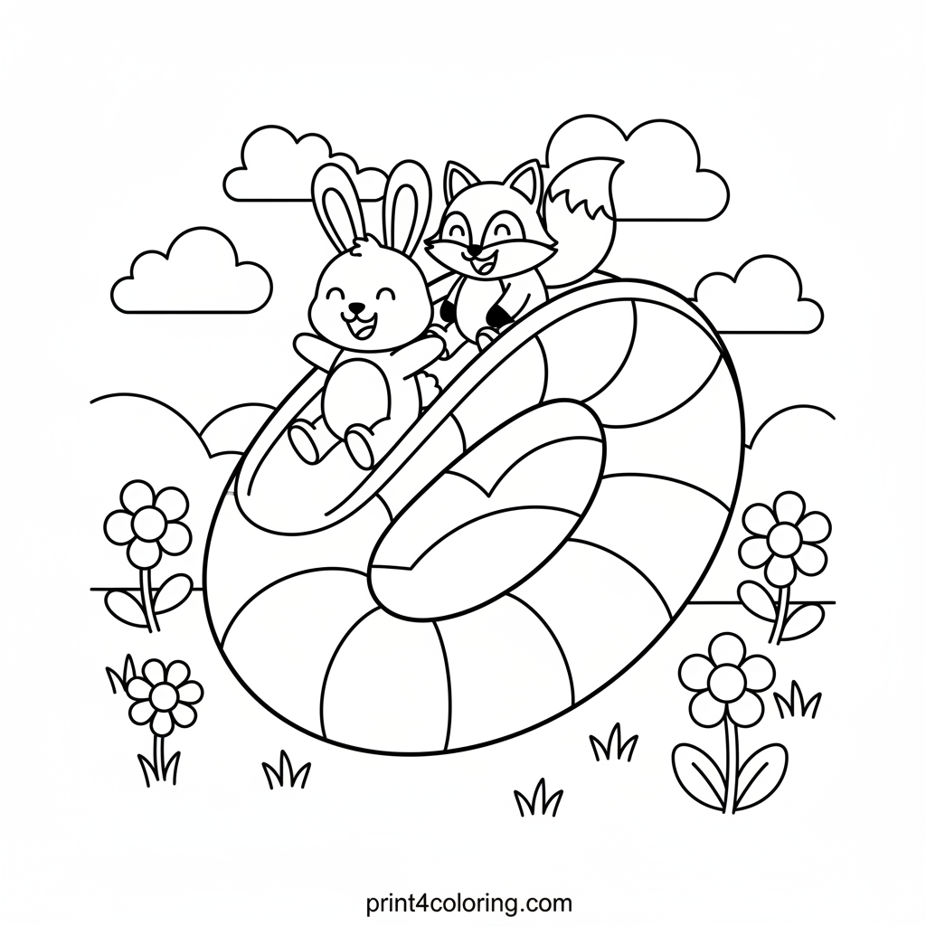 Join cute bunny and fox friends on a whimsical adventure! A giant, curly, rainbow-colored noodle serves as the most magical slide ever. Watch them giggle and zoom down, enjoying a day full of laughter and fun. This playful scene awaits your vibrant colors!
