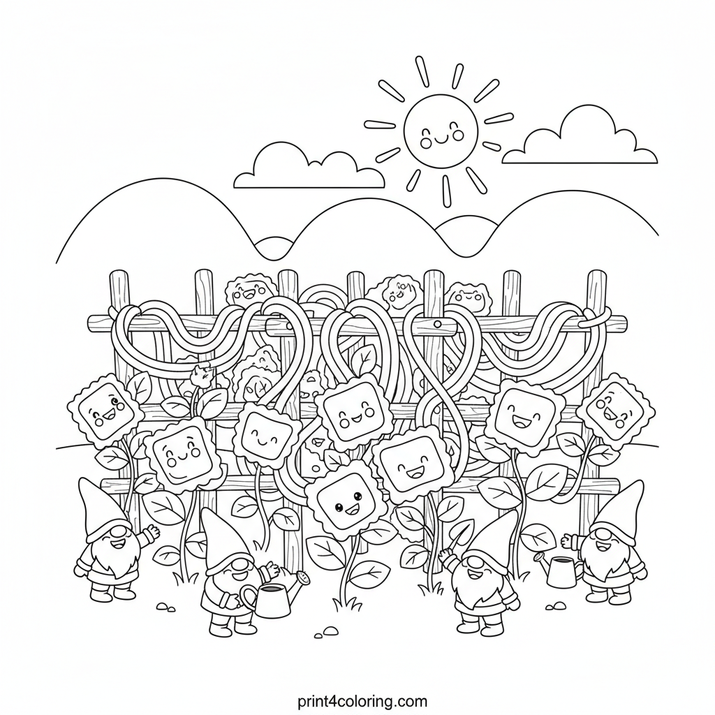 Step into a magical garden where delicious spaghetti twirls like vines and smiling ravioli leaves peek out from happy plants! Tiny, friendly garden gnomes with pointy hats carefully tend to this wondrous pasta patch. Grab your crayons and bring this delightful scene to life with vibrant colors, making every noodle and gnome shine!
