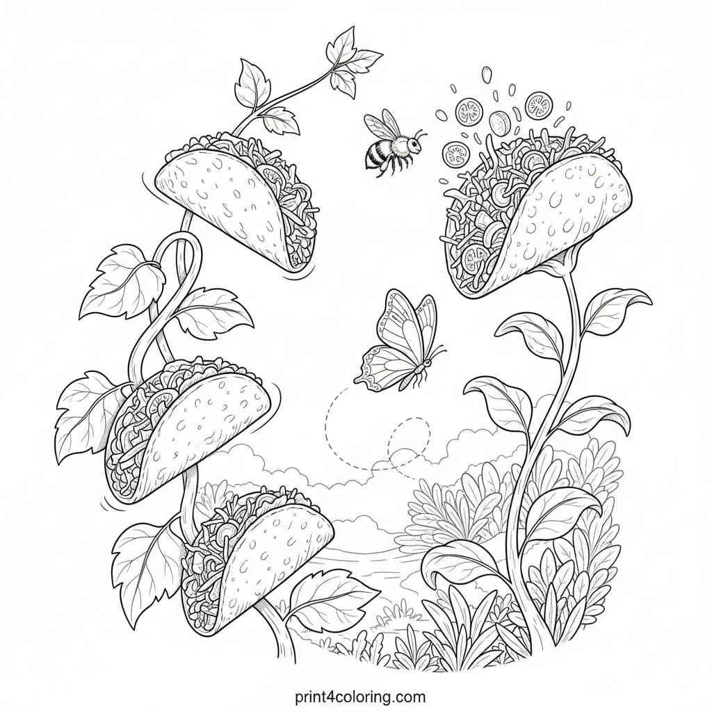 Whimsical Taco Garden: A Pollination Adventure Coloring Page