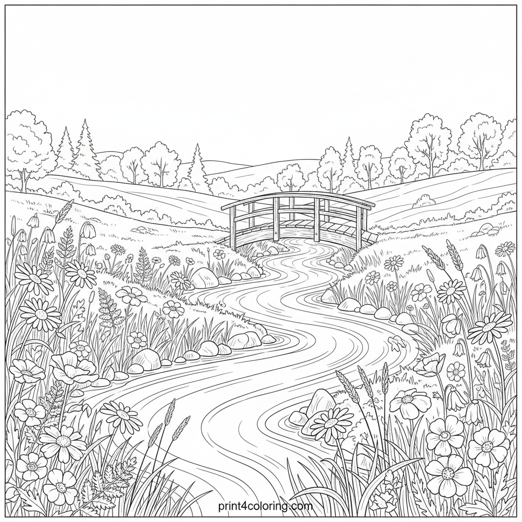 Explore a serene landscape where a gentle stream winds like flowing noodles. Discover individually drawn wildflowers and grasses along its banks. A charming, rustic wooden bridge invites you to cross and marvel at the intricate details of nature. Perfect for advanced colorists seeking a peaceful, detailed scene.