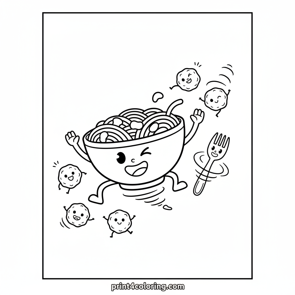 Get ready for a delicious adventure with this super happy spaghetti bowl! Our friendly spaghetti has a big wink and is surrounded by a lively bunch of smiling meatballs. A happy fork is ready to join the fun. Grab your crayons and bring this yummy scene to life with all your favorite colors – a delightful feast for your eyes!