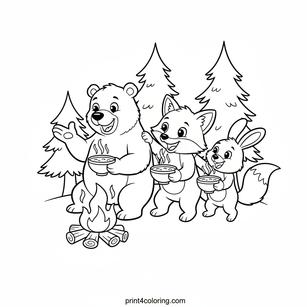 Gather 'round the cozy campfire with a happy bear, a clever fox, and a tiny bunny! These forest friends are sharing warm bowls of steaming soup and happy stories under the friendly forest trees. Bring this heartwarming scene to life with your favorite colors and imagine the delicious smells and laughter!