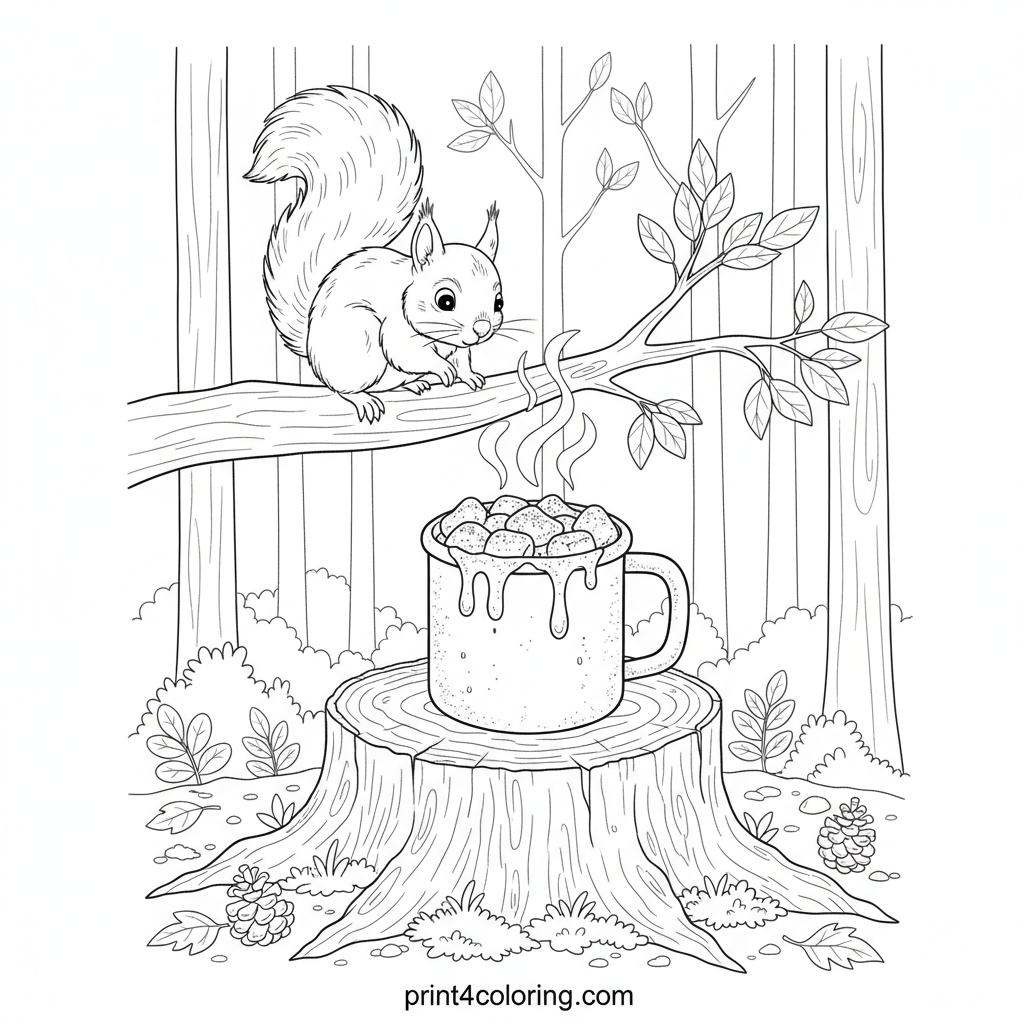 Discover a cozy forest scene featuring a steaming mug of hot chocolate, piled high with marshmallows and cocoa dust, resting on a rustic tree stump. A curious red squirrel with a magnificent bushy tail watches intently from a nearby branch, its paws delicately poised. Color this warm woodland treat!