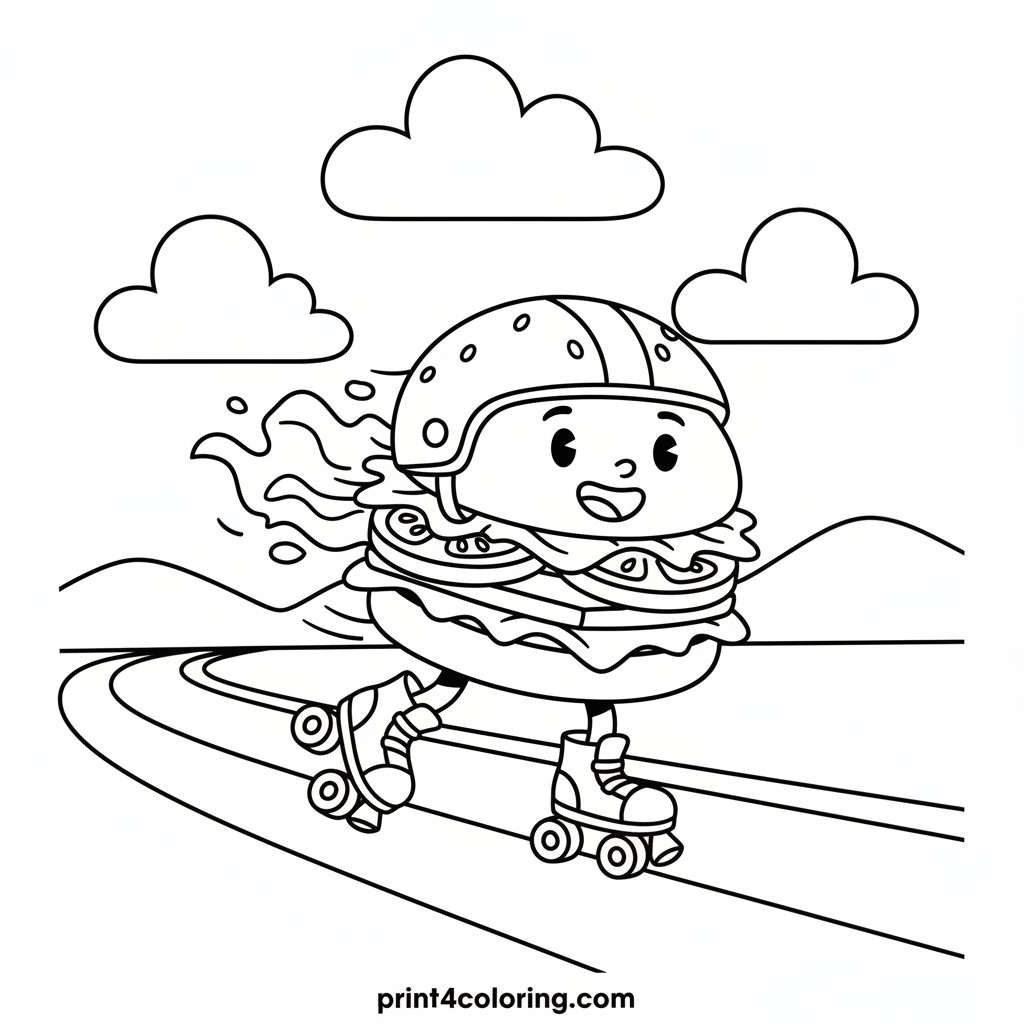 Join our cheerful burger friend as it zips down a winding path on roller skates! With a big smile and a cool helmet, watch its lettuce and tomato layers flutter in the breeze. This fun scene is perfect for little artists to bring to life with vibrant colors, capturing the joy of a speedy adventure.